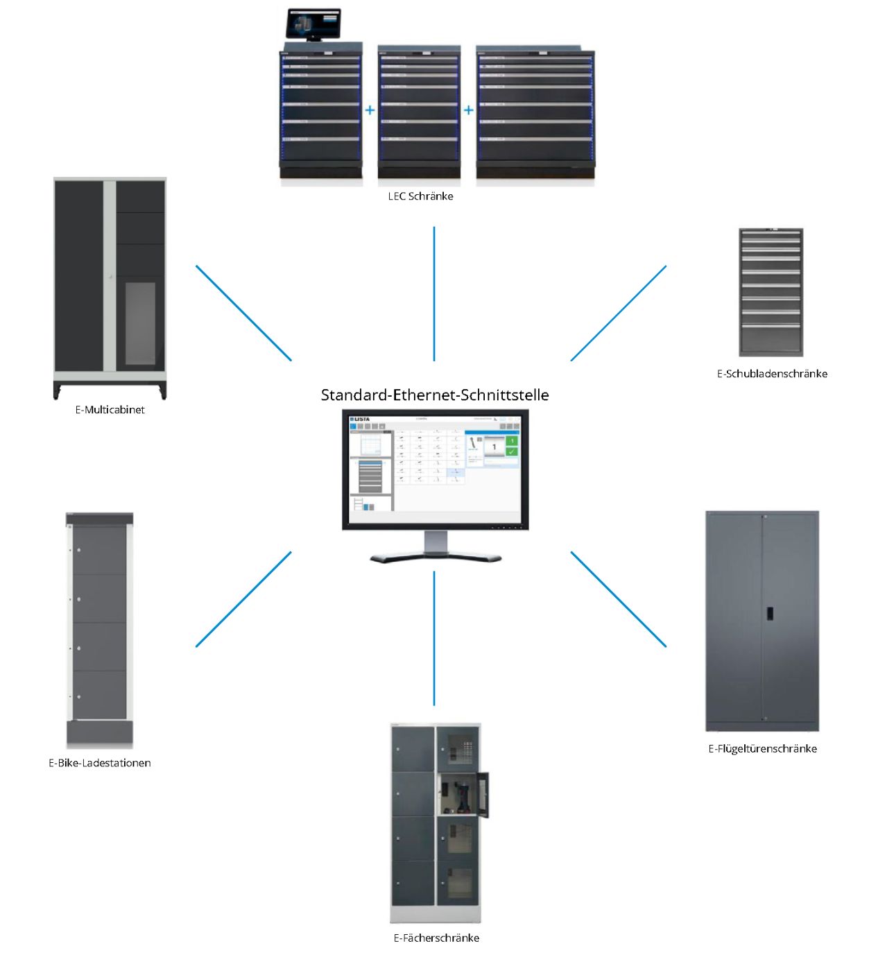 Wir bei LISTA möchten, dass Sie die Vorteile elektronischer Zugriffs- und Ausgabesysteme optimal nutzen können. Daher haben wir unser Sortiment modular aufgebaut, so dass Sie flexibel die Lösung zusammenstellen können, die zu Ihnen passt: Die beiden Produktlinien LISTA Electronic Control und LISTA E-Cabinets lassen sich individuell konfigurieren und vielseitig kombinieren,
