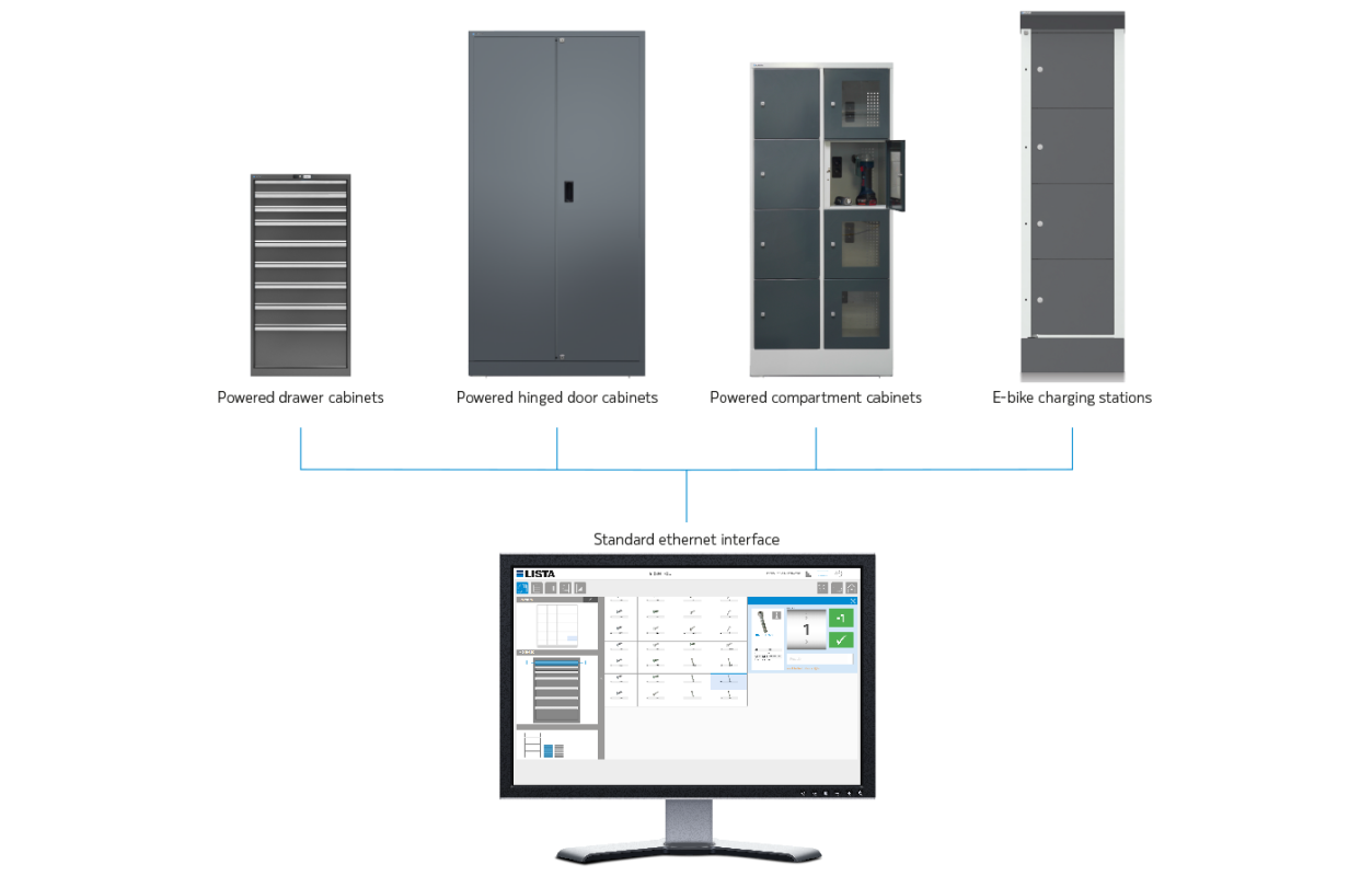 The standard ethernet interface allows you to connect all E-Cabinets to LISTA E-Control and integrate them into your access or warehouse management system.